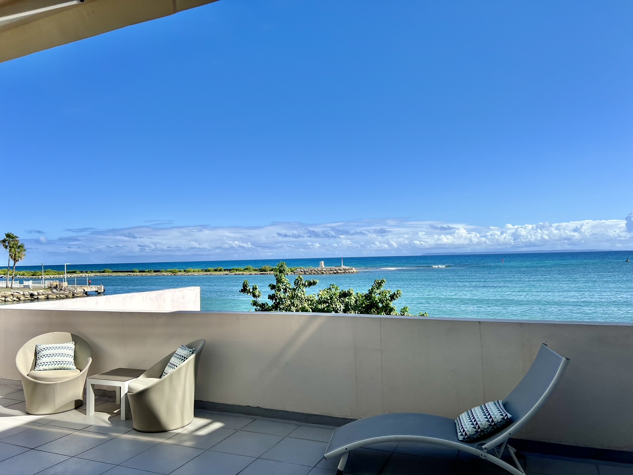 Le séjour est ouvert sur une vue mer imprenable face à l’île de Marie-Galante.