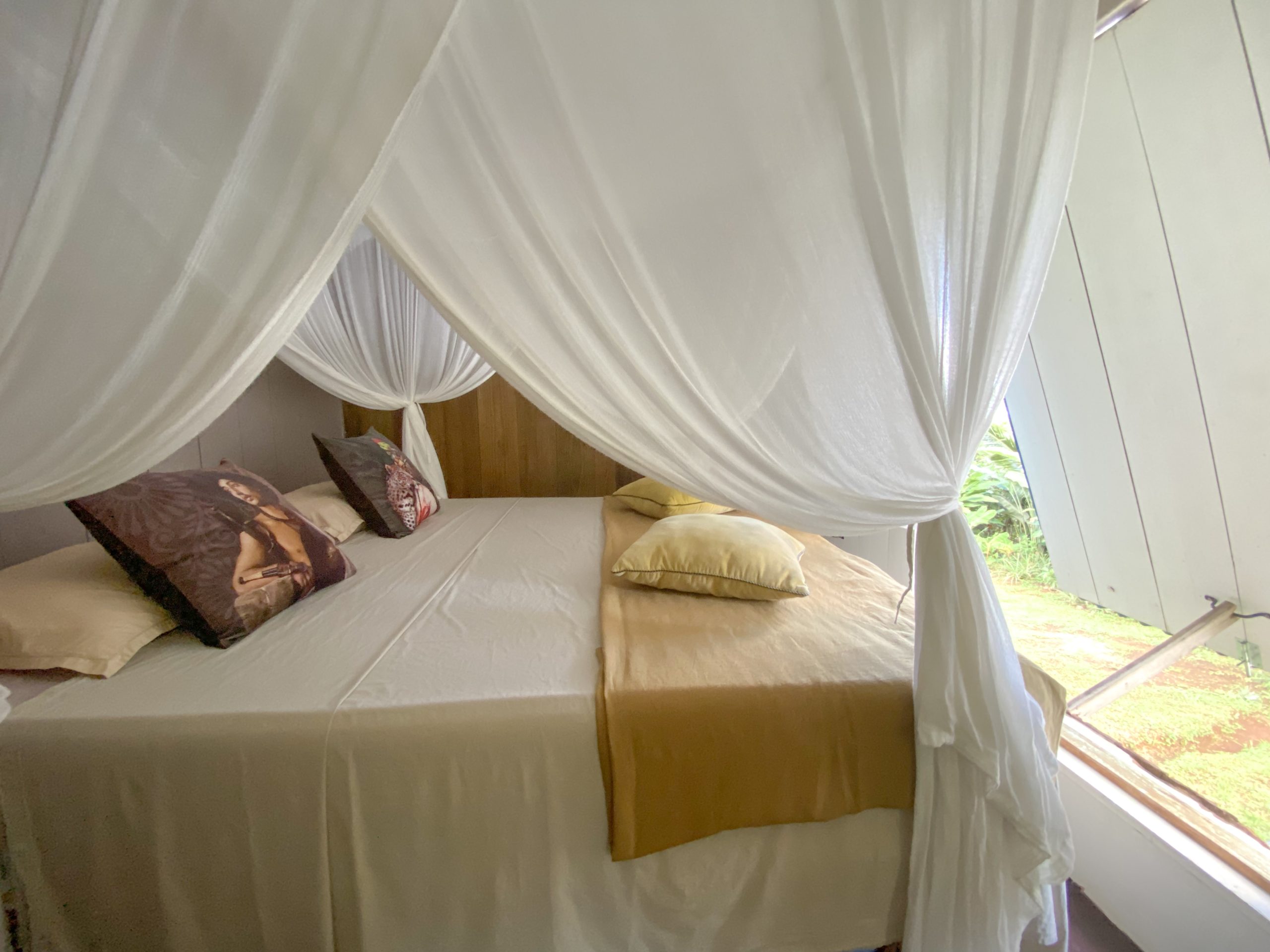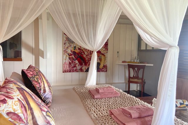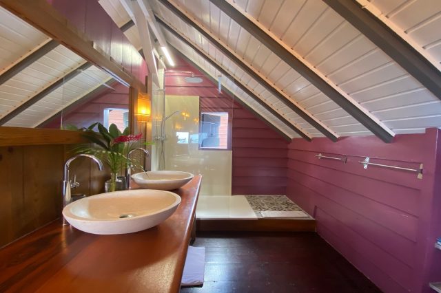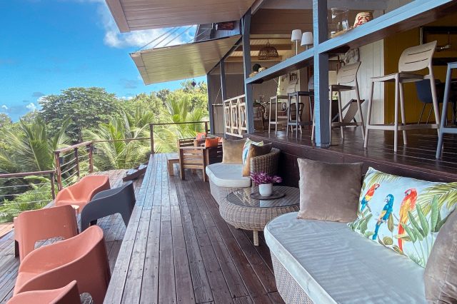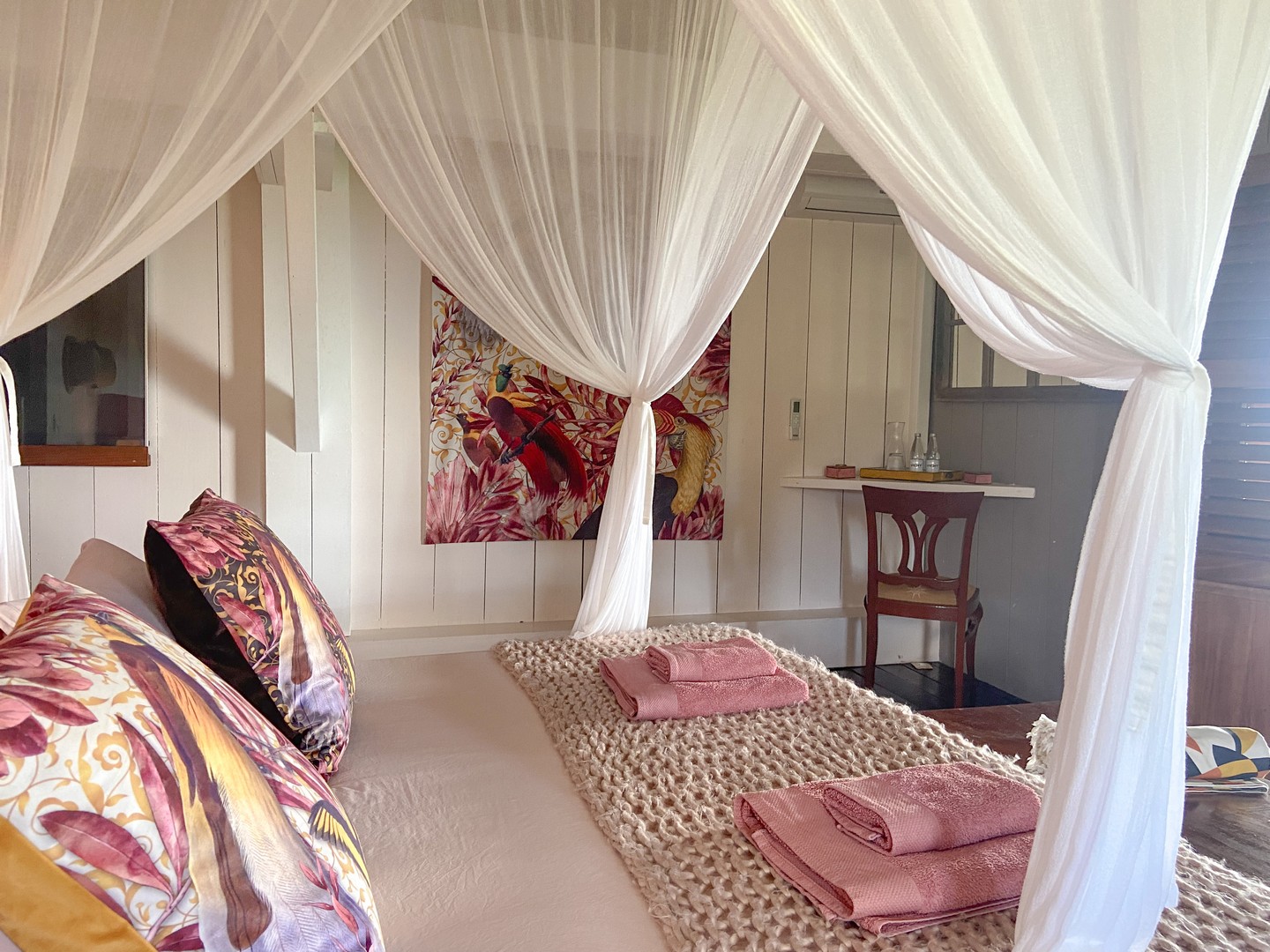 Les pièces de vie sont ouvertes sur les terrasses et la vue exceptionnelle. Les chambres, bien que situées dans le corps principal, sont toutes dotées d’une entrée privative et d’une salle d’eau individuelle, créant une atmosphère de charmantes suites tropicales.