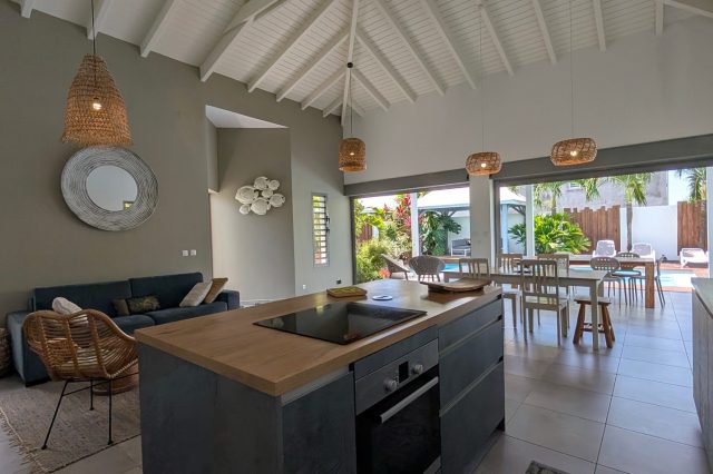 Une grande pièce à vivre comprenant salon, salle à manger et cuisine ouverte, sublimée par une charpente traditionnelle antillaise apparente et une hauteur sous plafond spectaculaire, apportant lumière et élégance.
