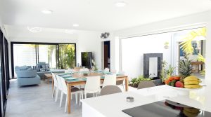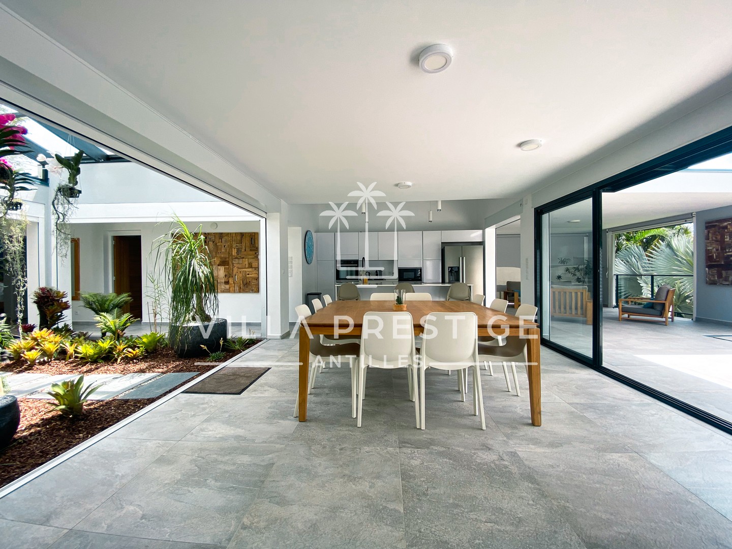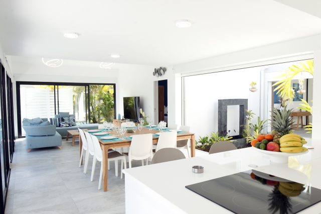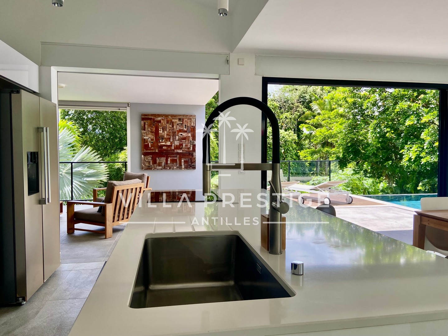 La cuisine équipée avec îlot central s’ouvre sur deux salons extérieurs distincts, prolongés par une vaste terrasse et une piscine à débordement, bordée de végétation.