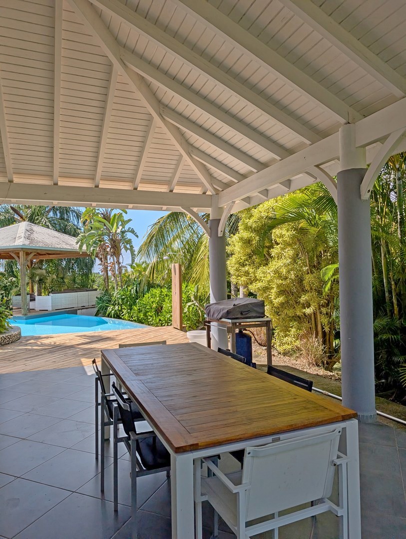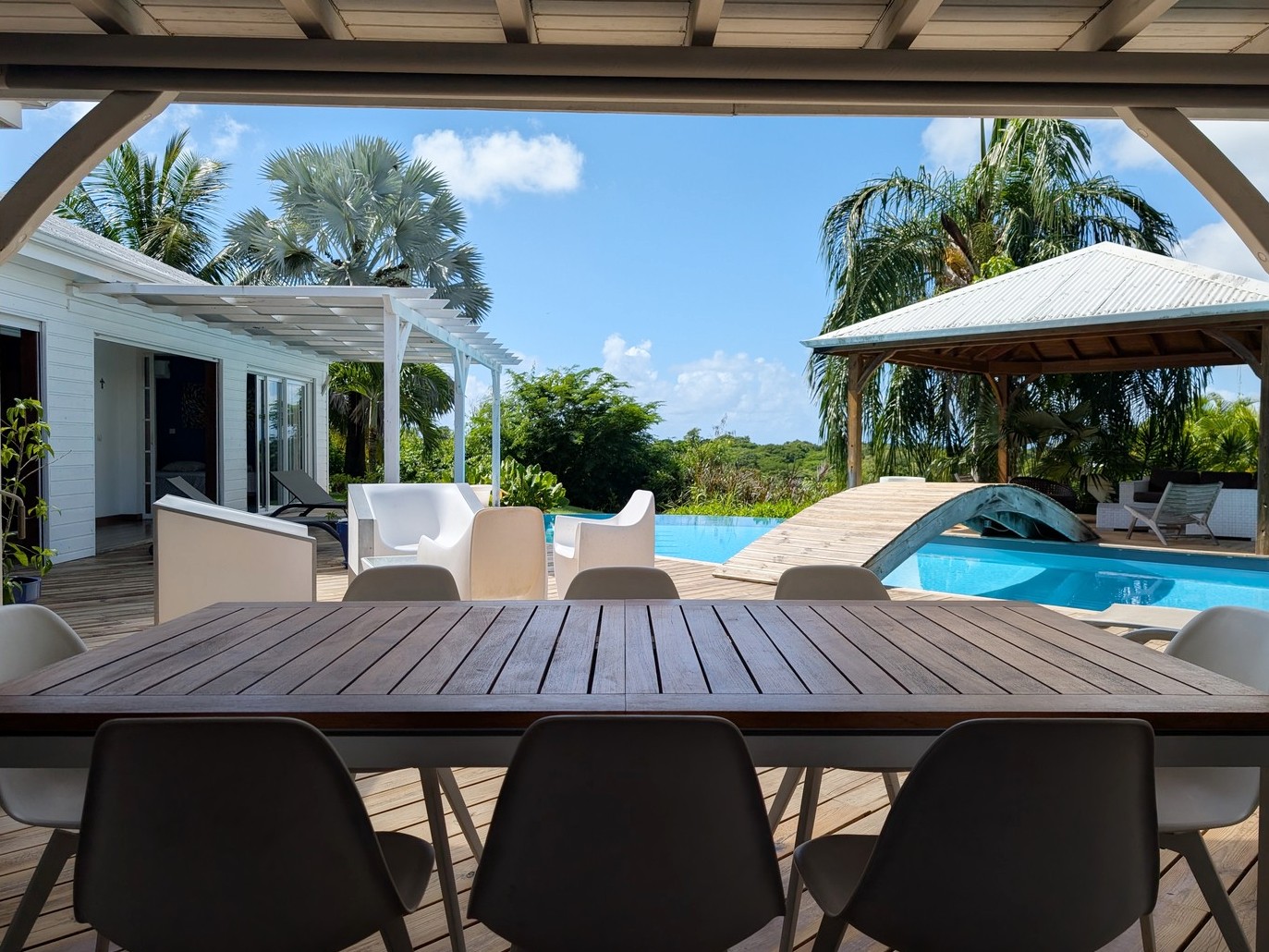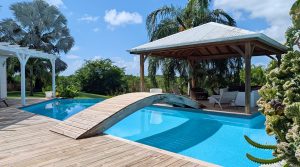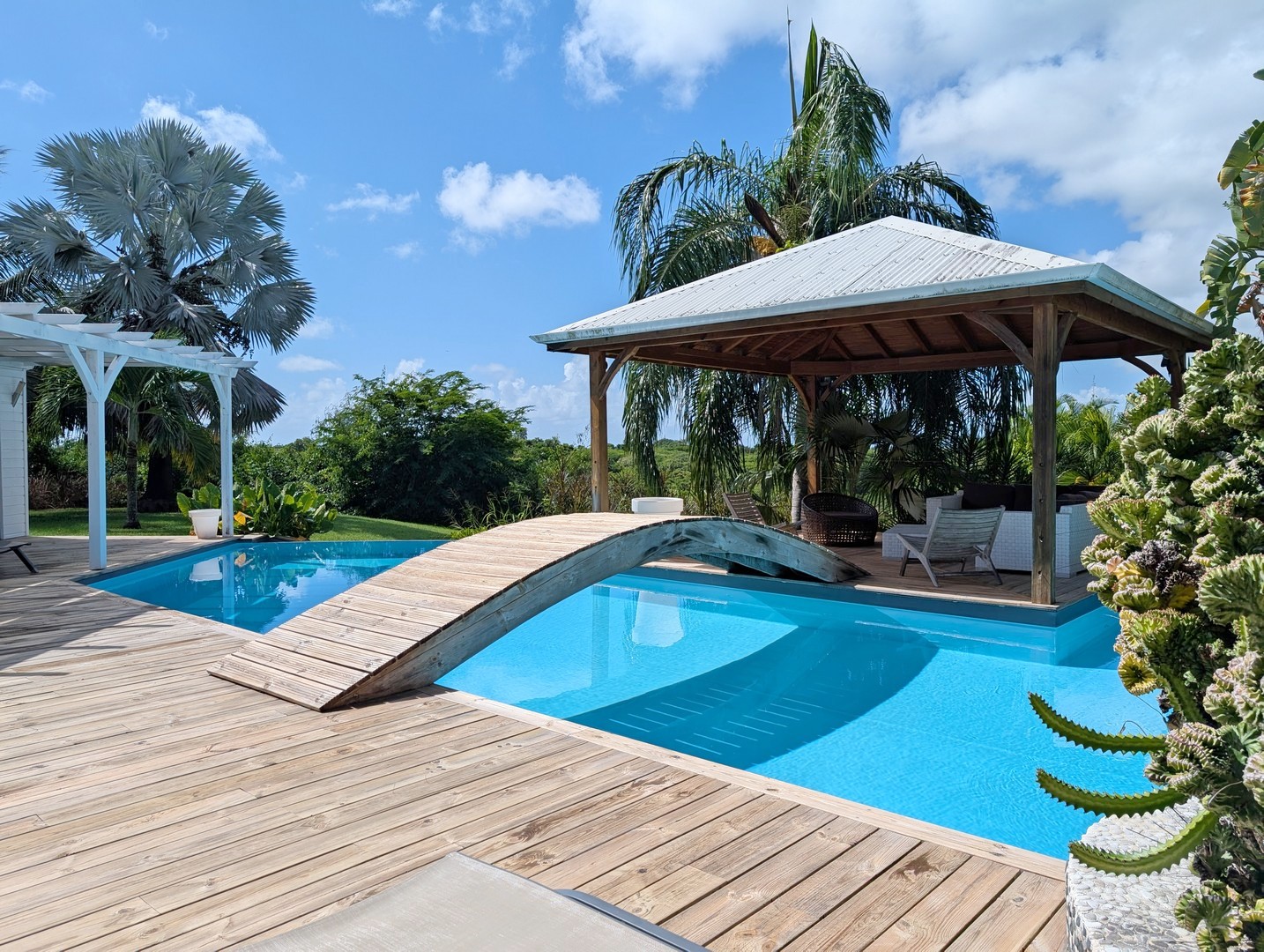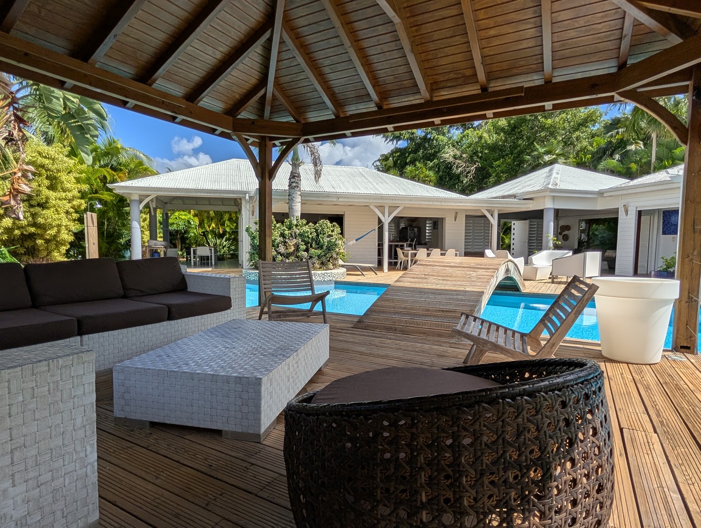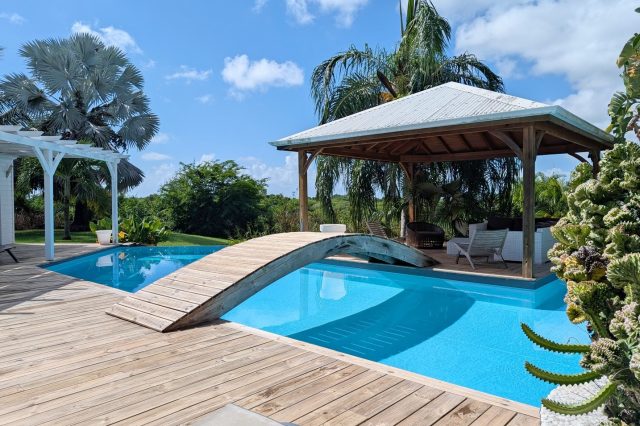 Passerelle en bois menant à un superbe carbet, véritable espace de détente dominant la piscine,