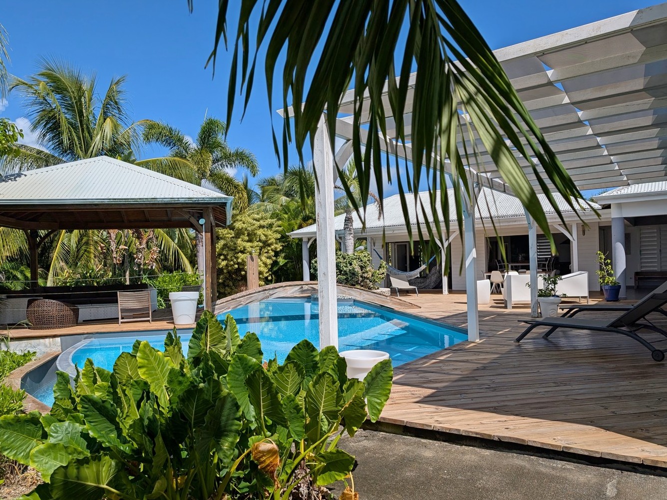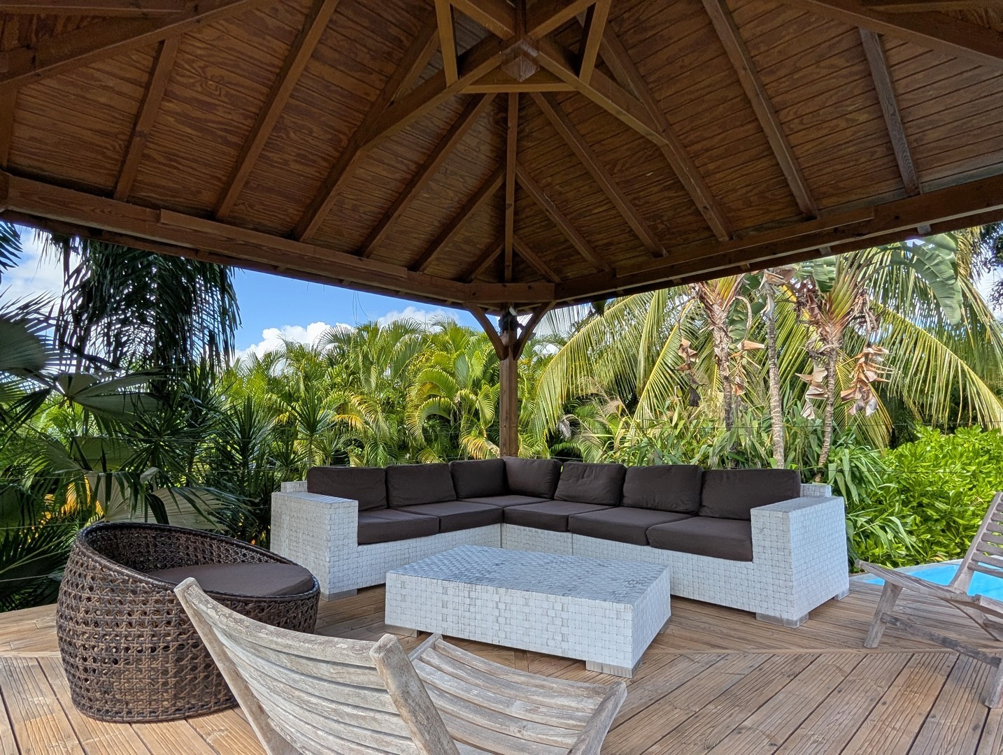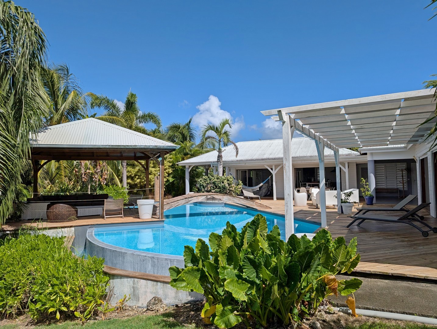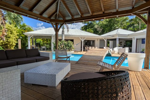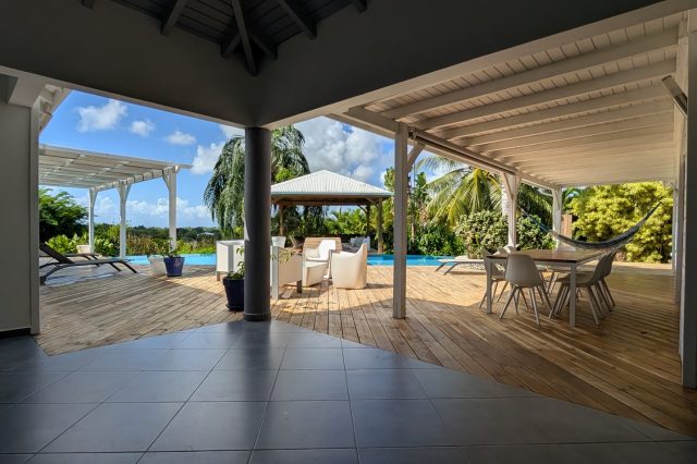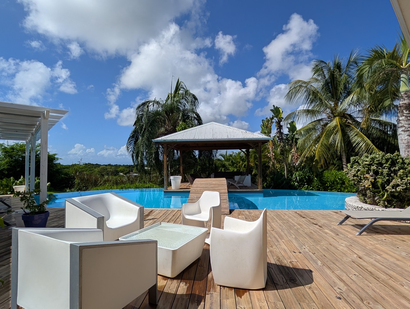 Passerelle en bois menant à un superbe carbet, véritable espace de détente dominant la piscine,