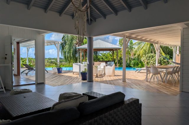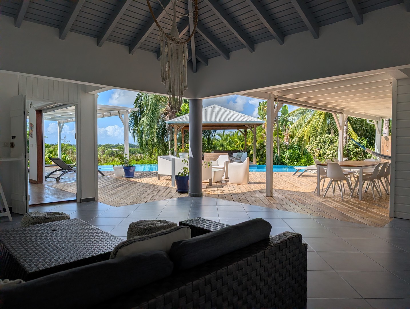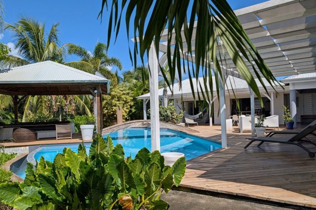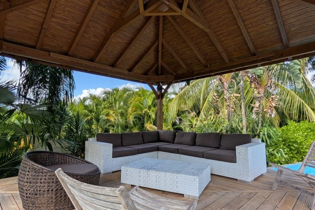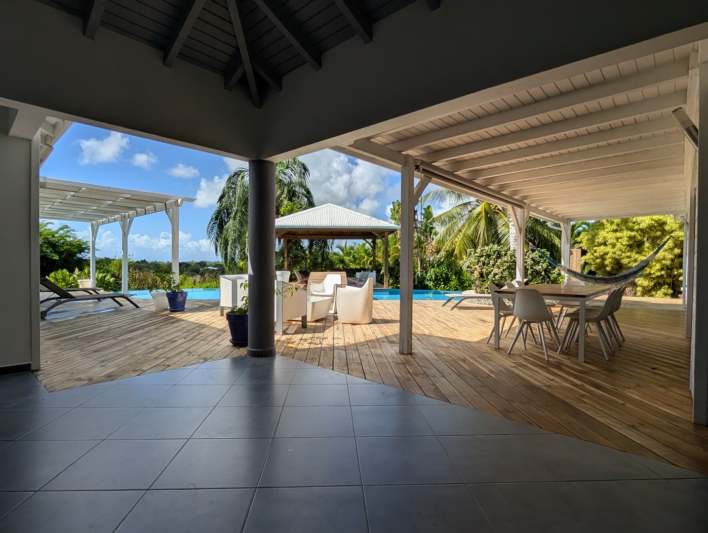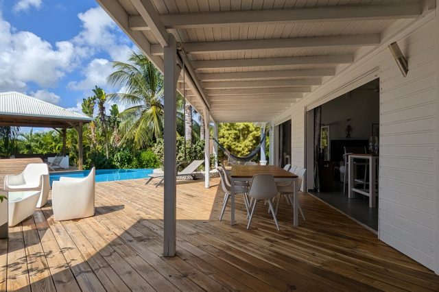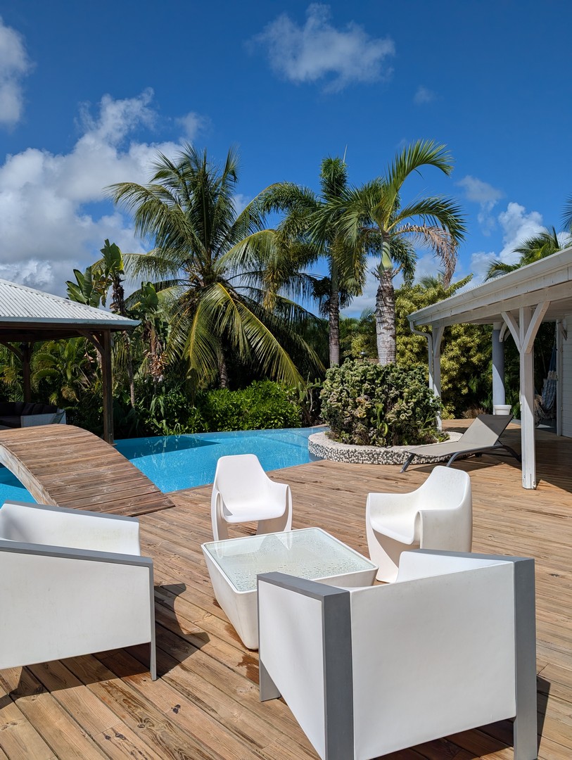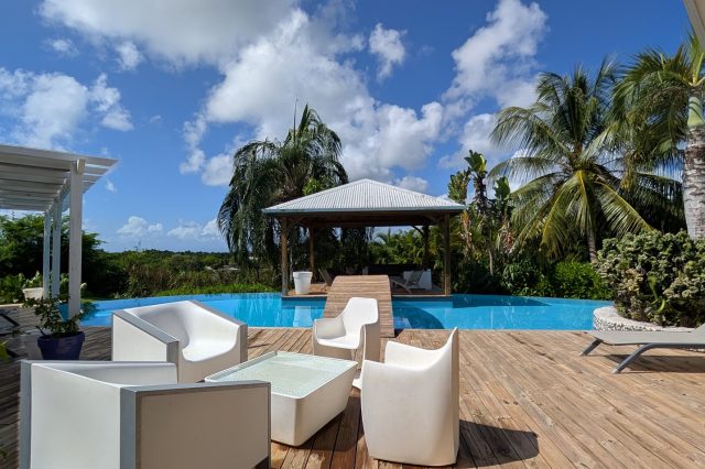 Passerelle en bois menant à un superbe carbet, véritable espace de détente dominant la piscine,