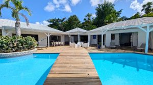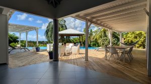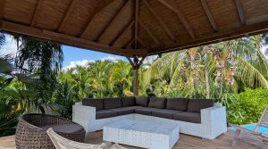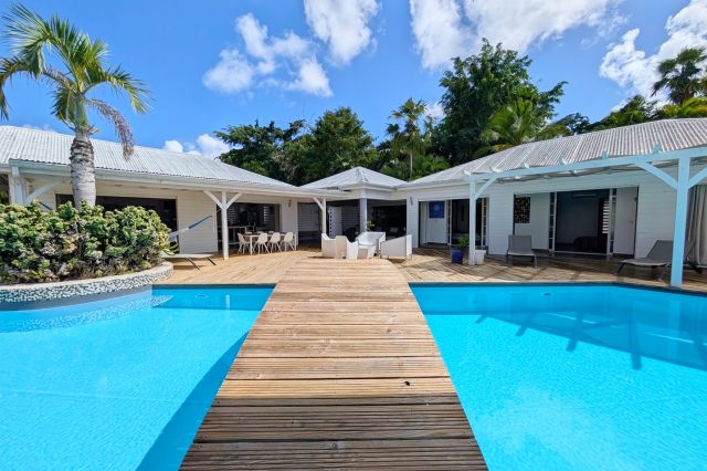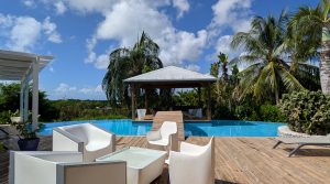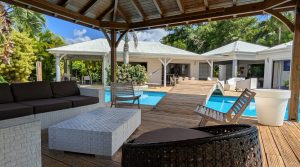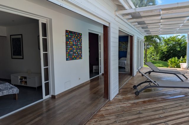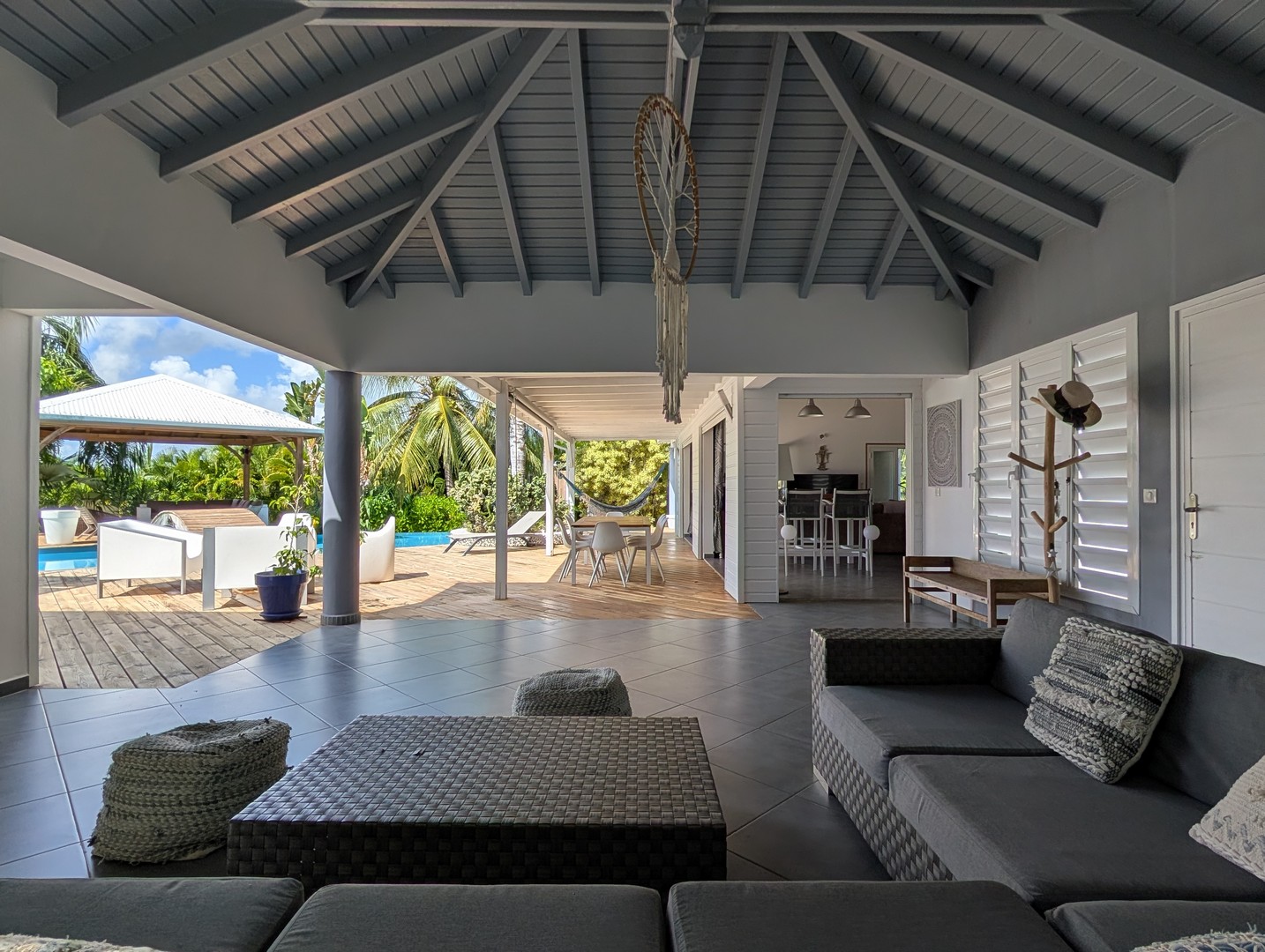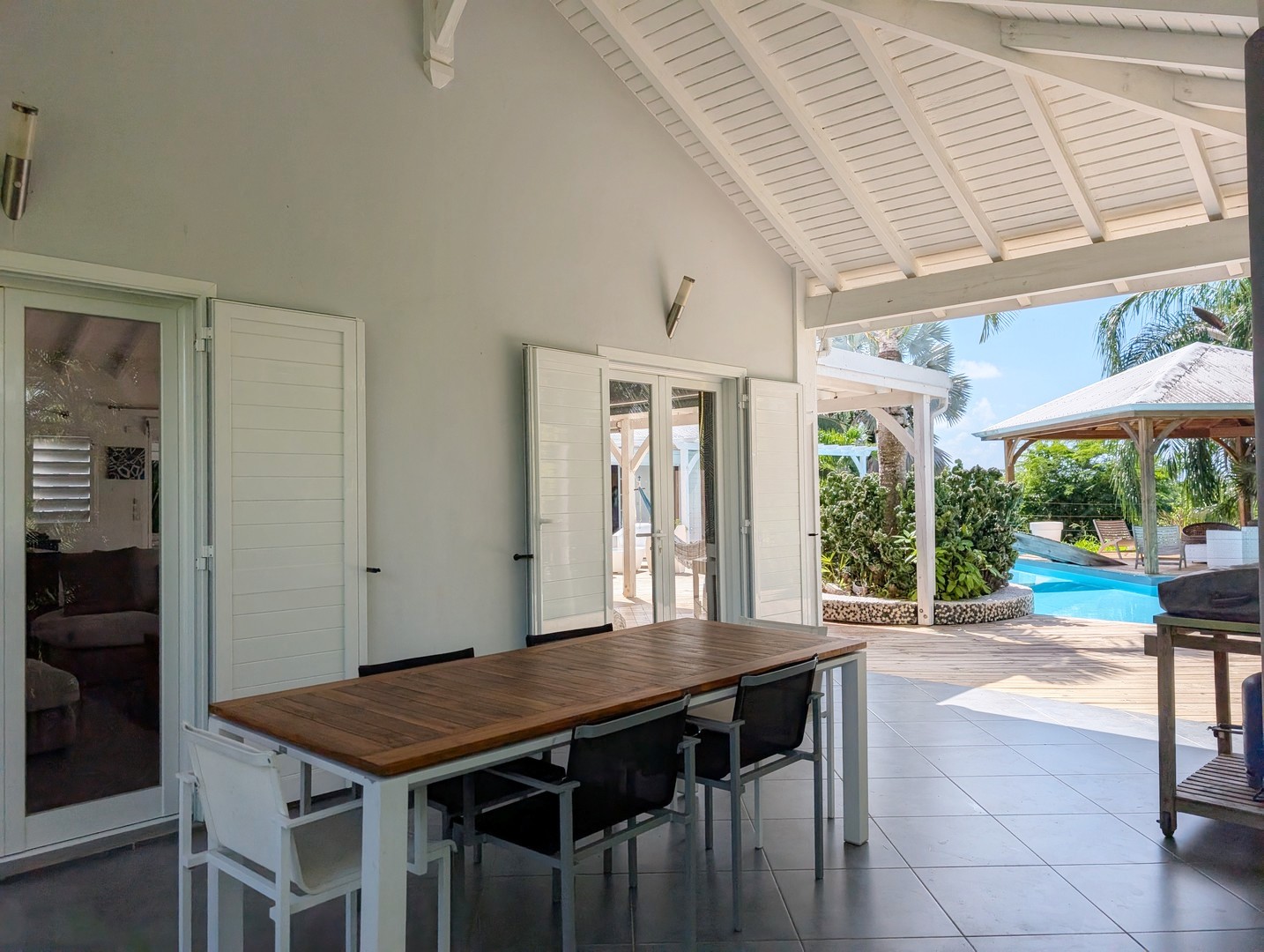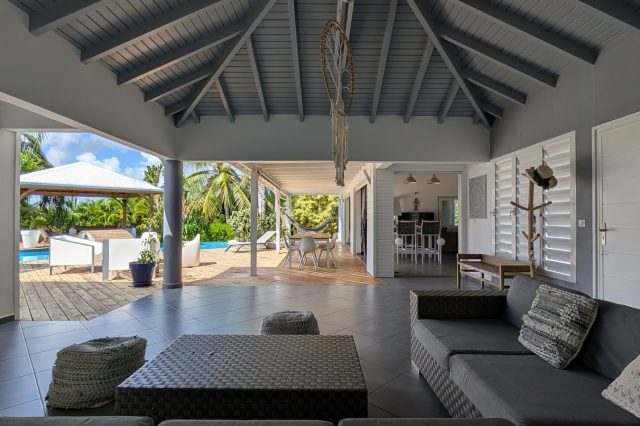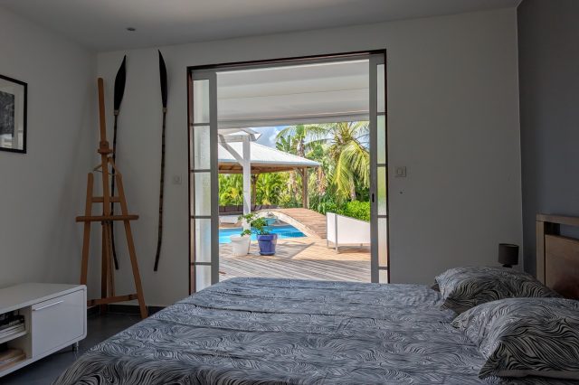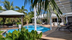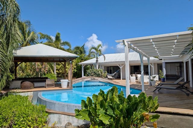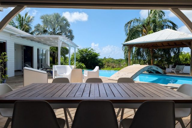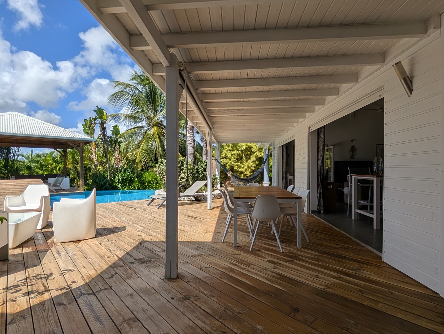 Passerelle en bois menant à un superbe carbet, véritable espace de détente dominant la piscine,