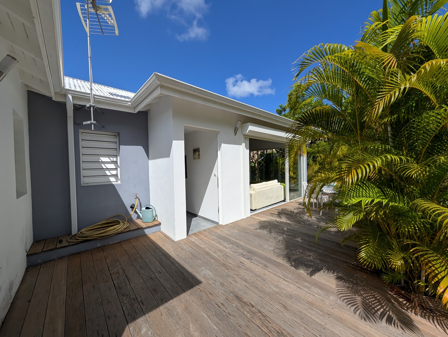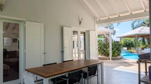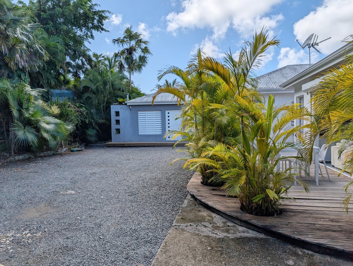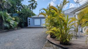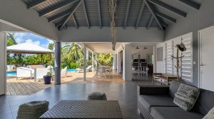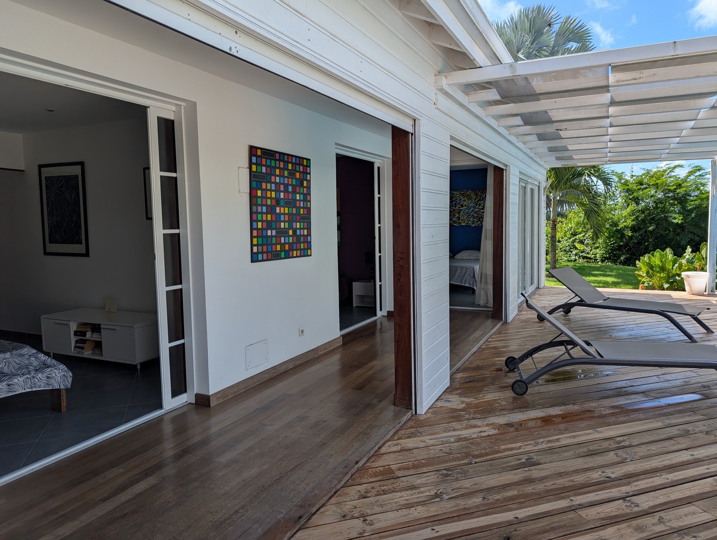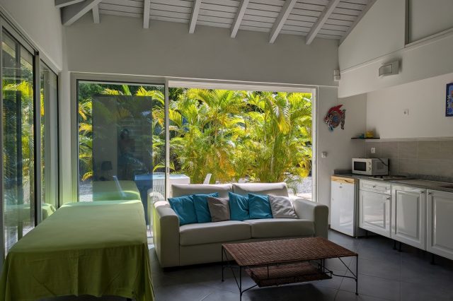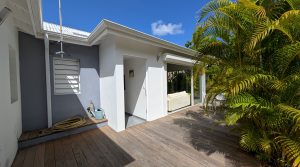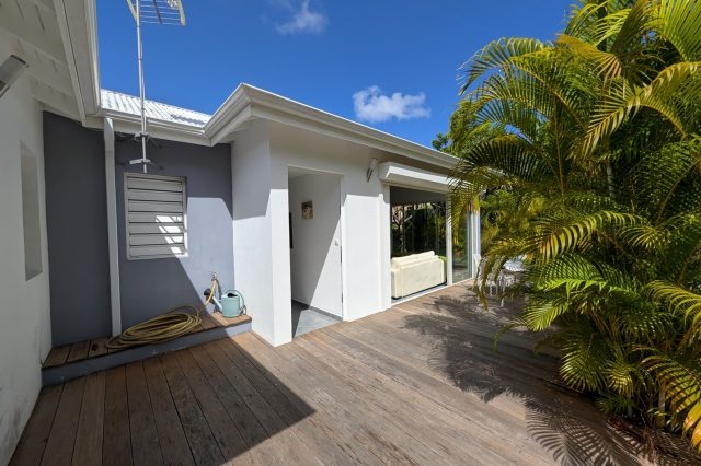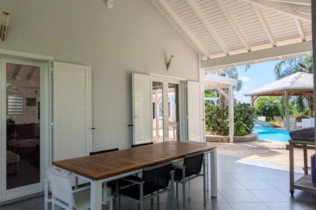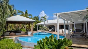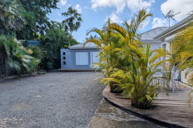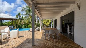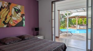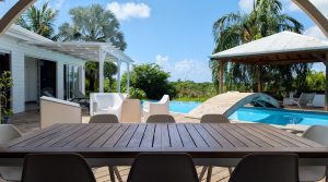 Passerelle en bois menant à un superbe carbet, véritable espace de détente dominant la piscine,