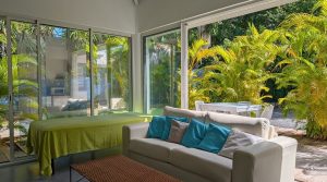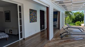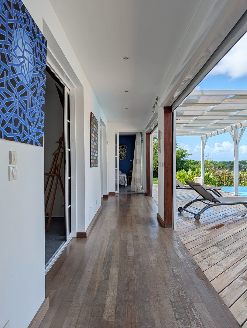 Un couloir ouvert sur le deck de la piscine grâce à des volets roulants, créant une continuité dedans/dehors,