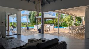 Au cœur de la villa, une superbe entrée offre une mise en scène unique, avec d’un côté le jardin intérieur et de l’autre la piscine, apportant une luminosité naturelle exceptionnelle.