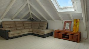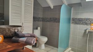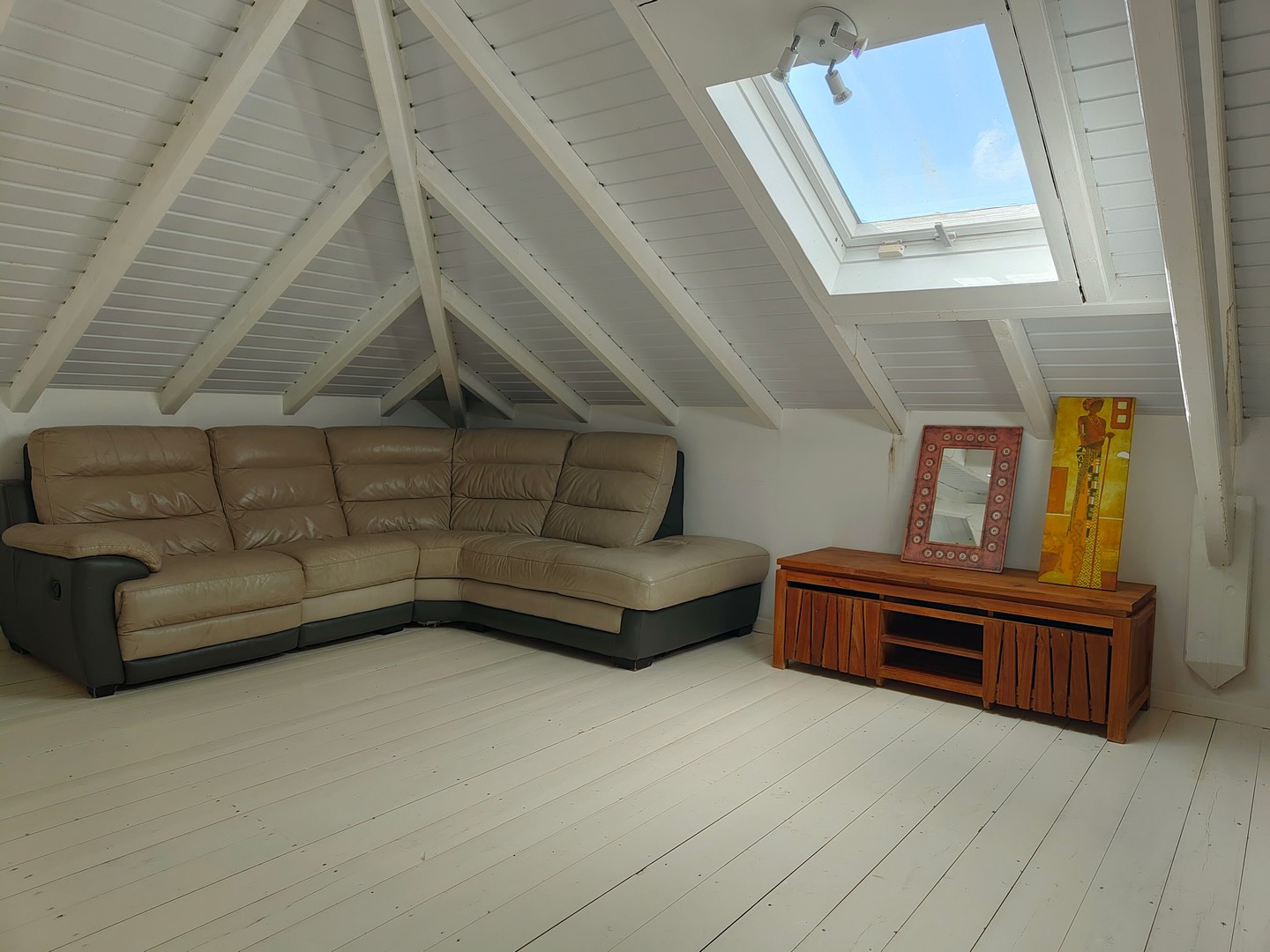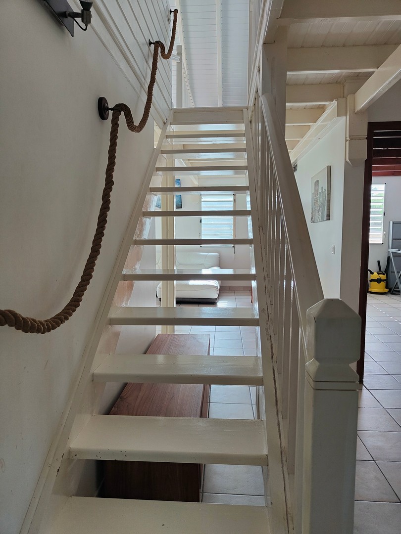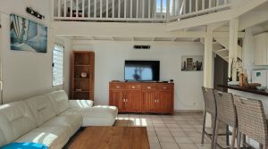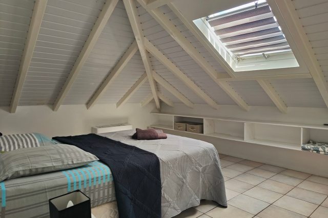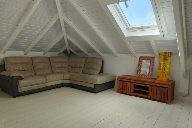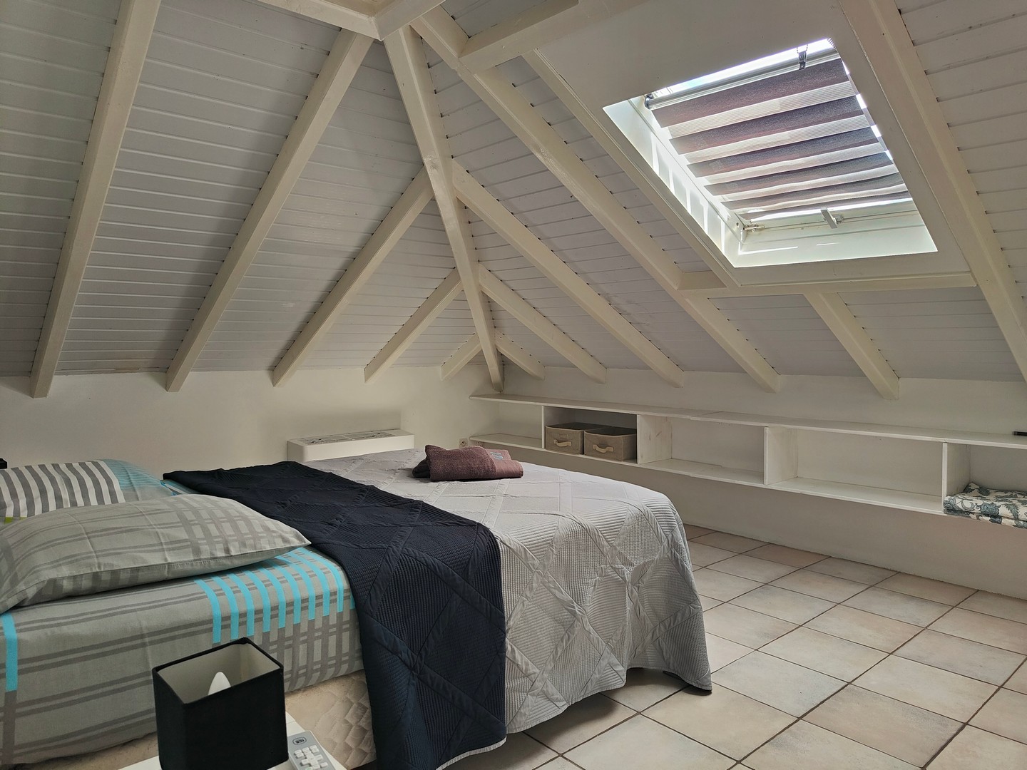 A l’étage, une mezzanine ouverte, deux chambres climatisées sous combles, une salle de douche avec un wc, un grenier