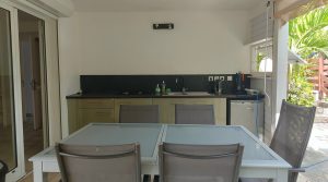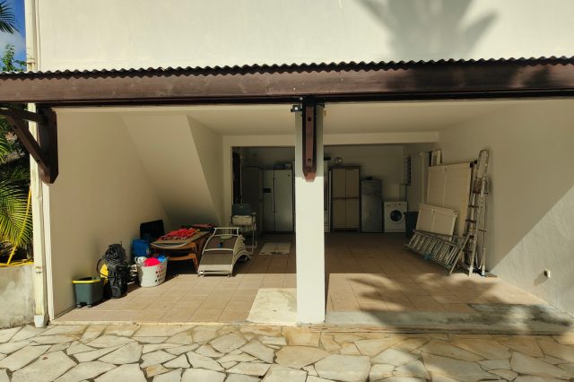 Au rez-de-chaussée, un parking pour deux voitures, une entrée, 2 chambres climatisées et une salle de bain avec wc, un wc indépendant, une cuisine ouverte, un salon, un cellier, une grande terrasse couverte avec vue mer et jardin.