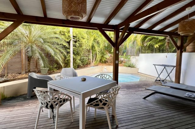 • Logement 1 (≈ 55 m²) : 2 chambres, salon/cuisine, salle d’eau, terrasse couverte, bar à punch, petite piscine privative et jardin.