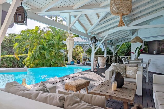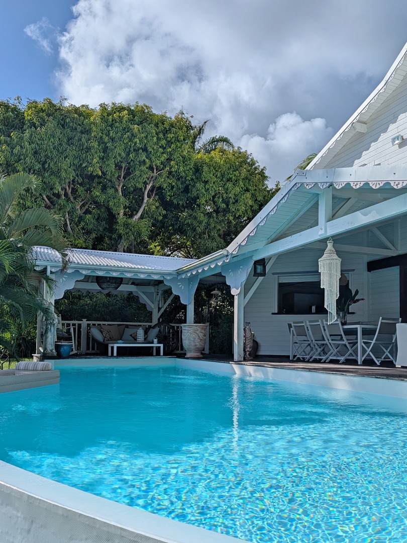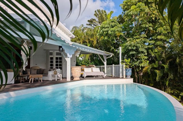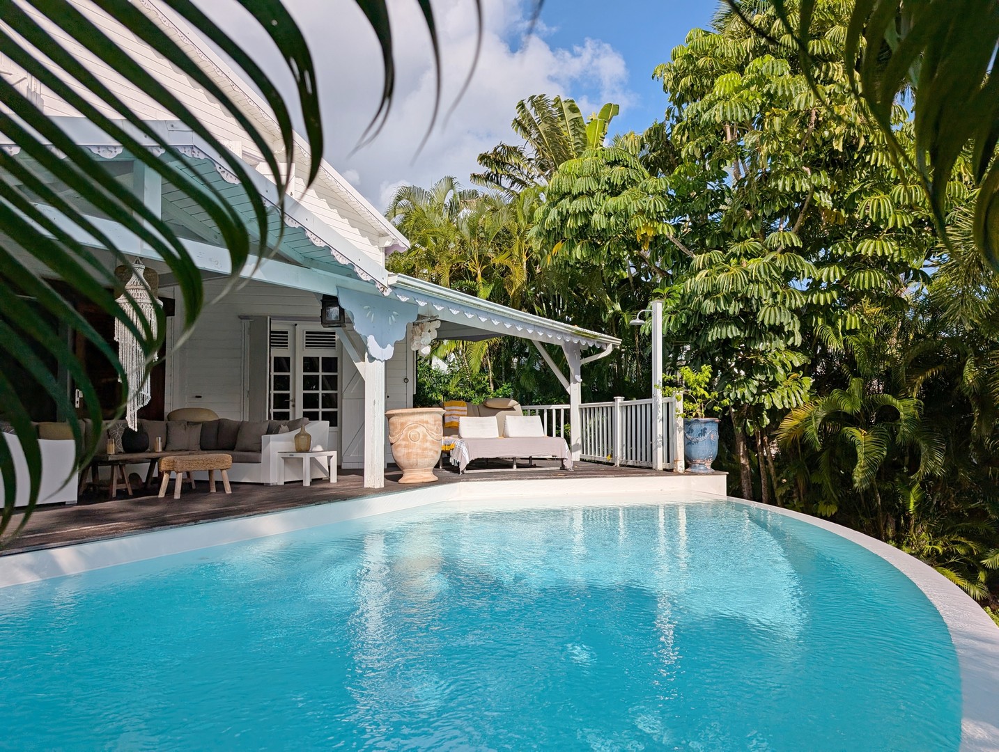 Le jardin arboré entoure une piscine au sel a débordements, idéalement intégrée au deck en IP, pour une ambiance élégante et naturelle.