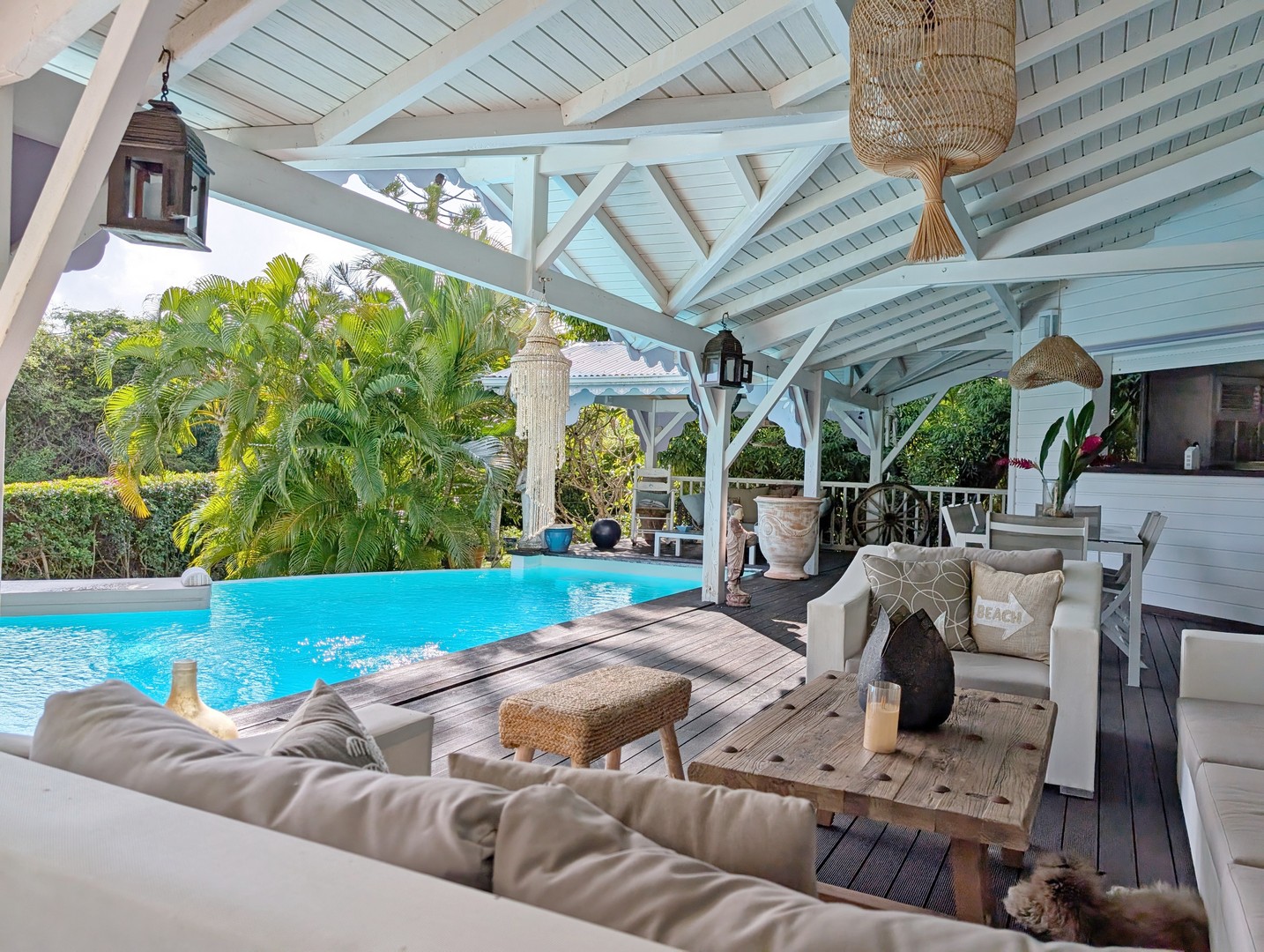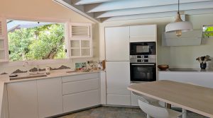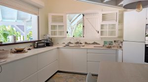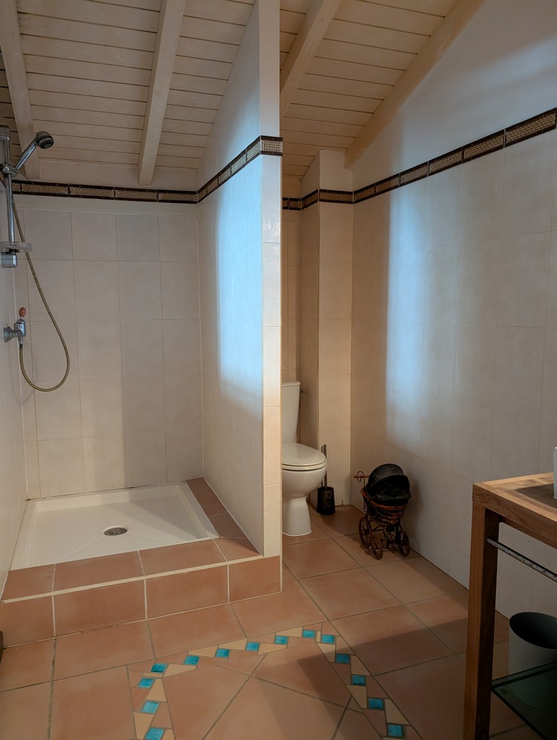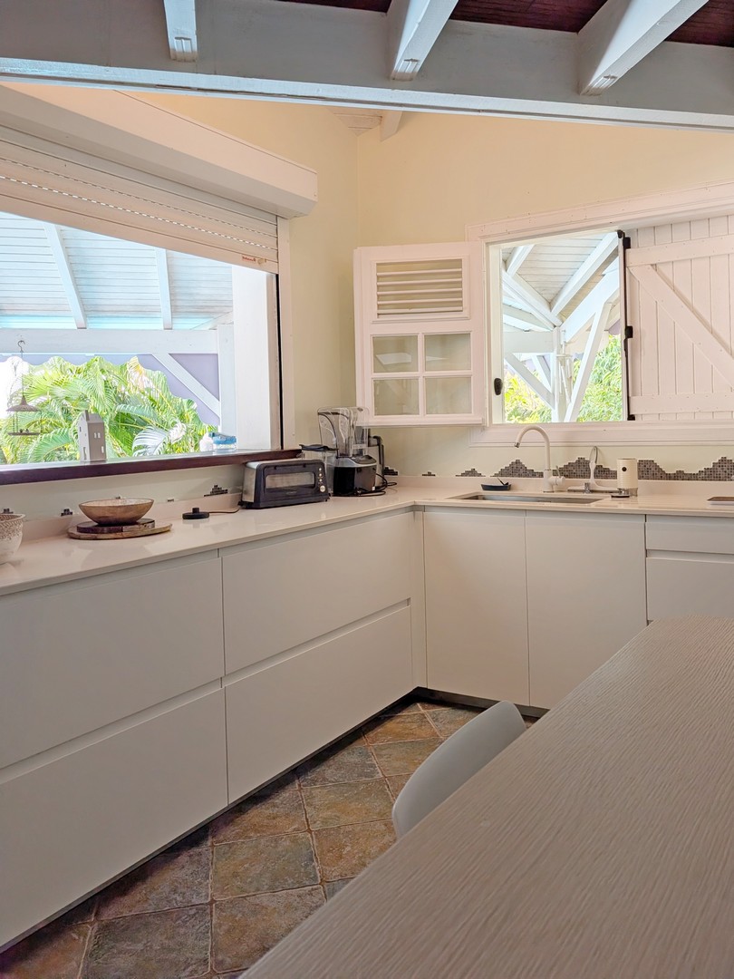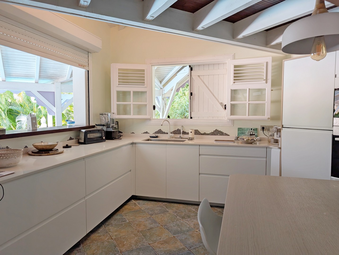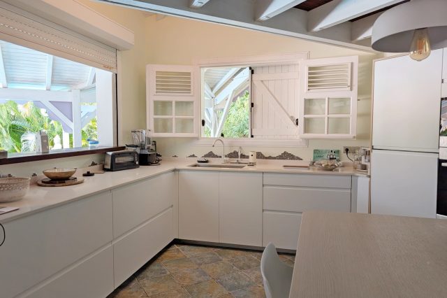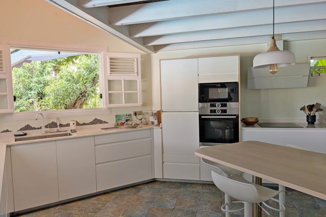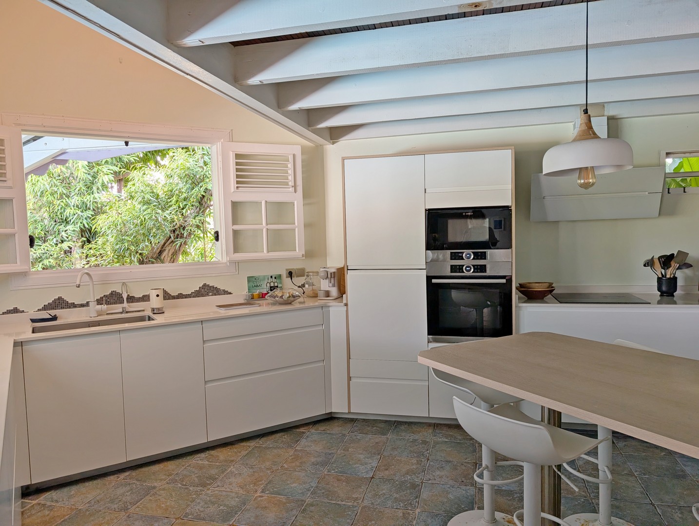 Le rez-de-chaussée s’ouvre ensuite sur un vaste espace de vie tourné vers l’extérieur. La cuisine moderne, entièrement équipée et dotée d’un passe-plat vers la terrasse, communique harmonieusement avec le séjour ventilé et lumineux. Les volets en bois ajourés apportent un charme singulier tout en laissant circuler l’air et la lumière.