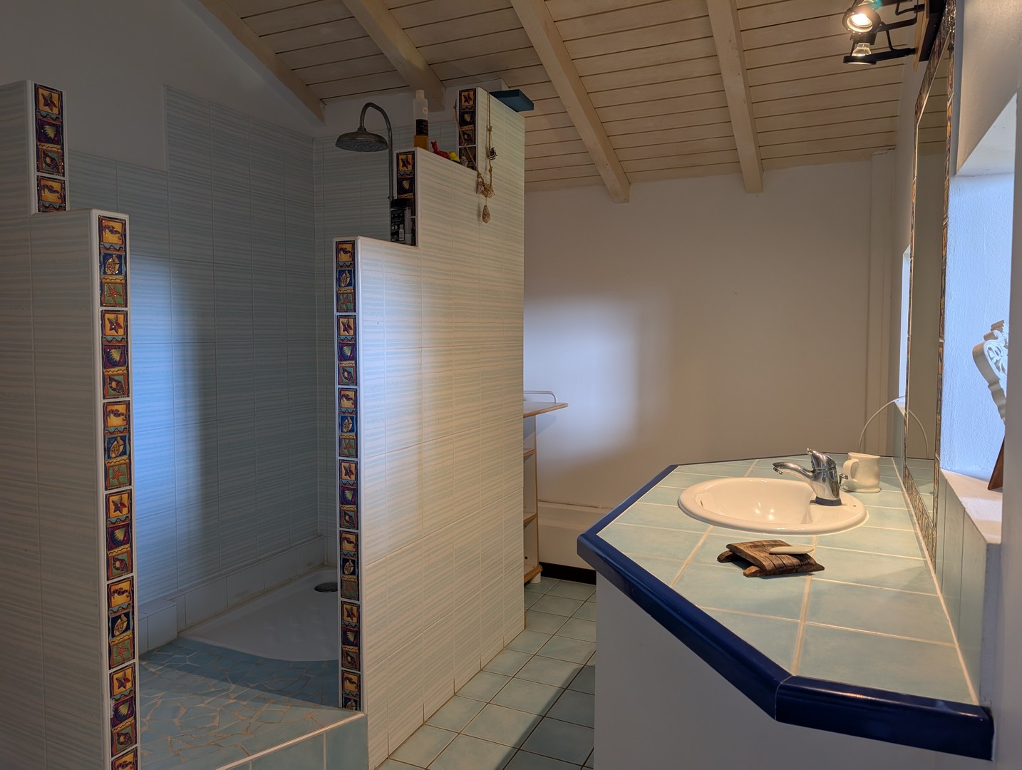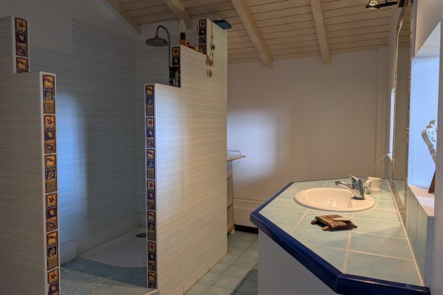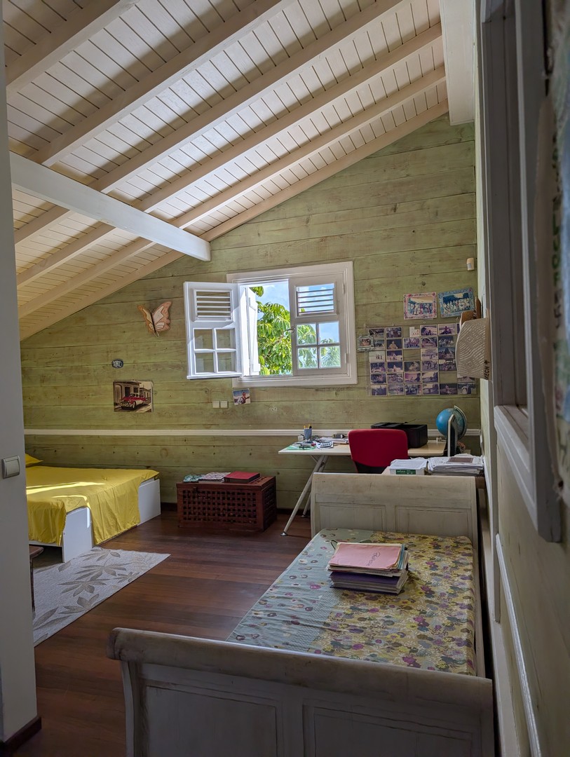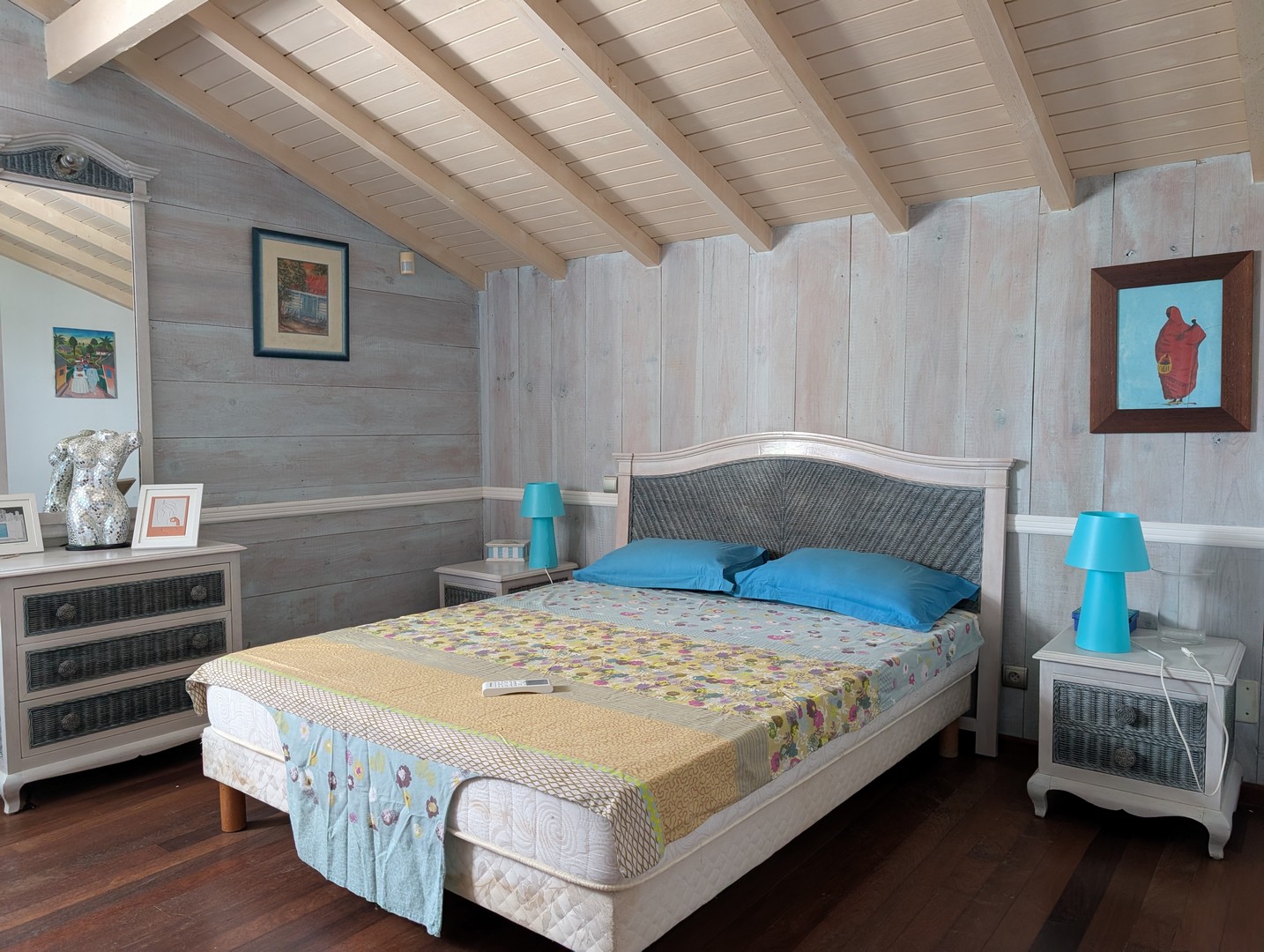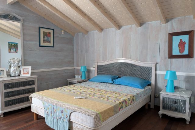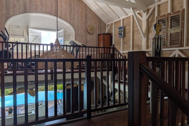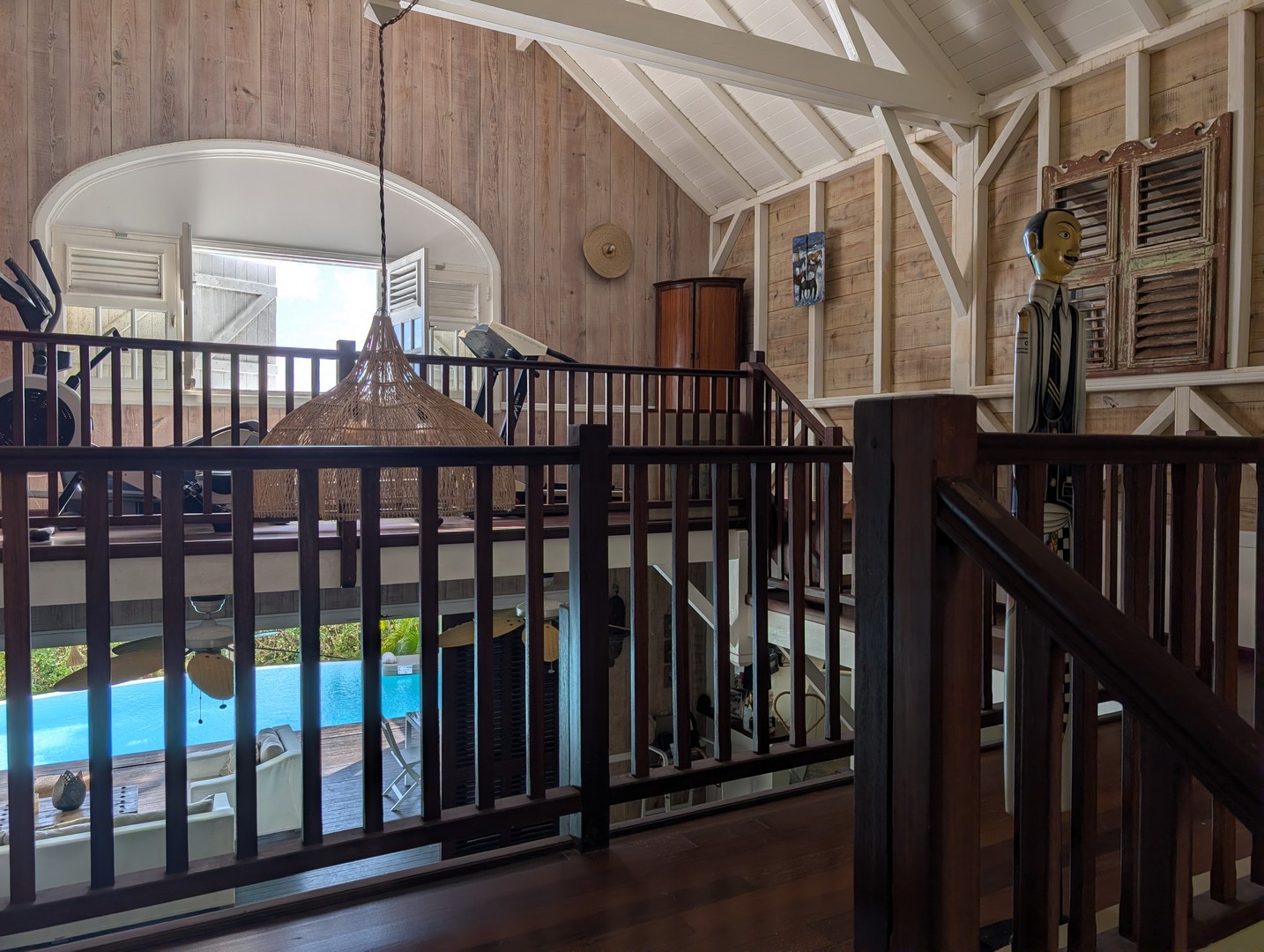 À l’étage, une mezzanine ouverte profite d’une vue mer dégagée et accueille actuellement un espace sport. Deux chambres supplémentaires, chacune avec salle d’eau ou salle de bain privative et WC, complètent ce niveau. Les parquets en IP rouge renforcent l’harmonie et l’esprit chaleureux de la maison.