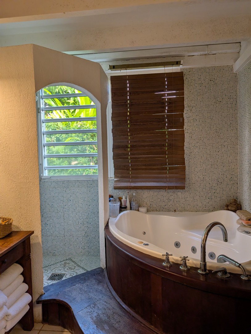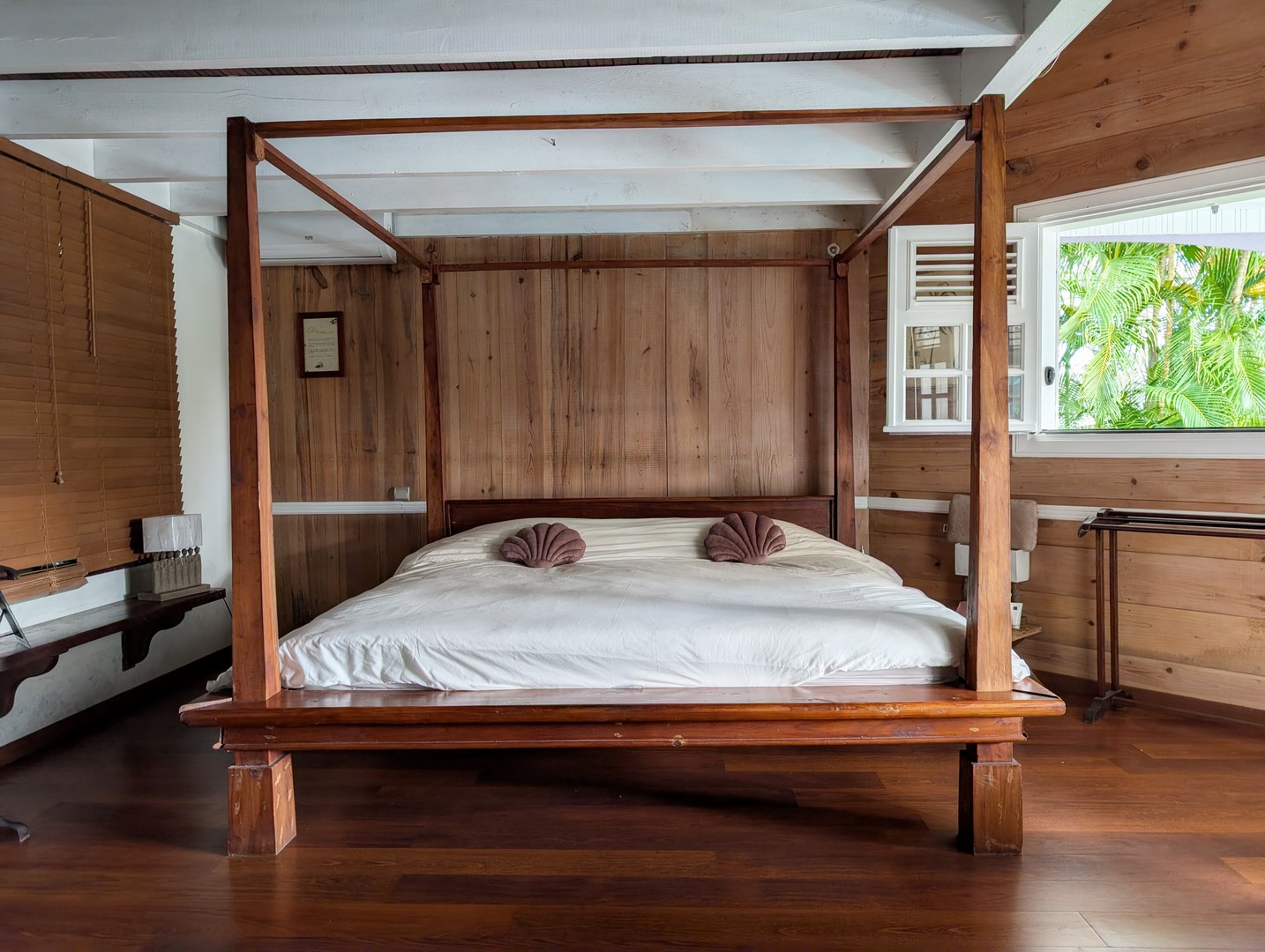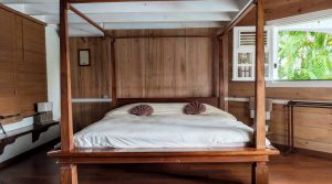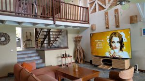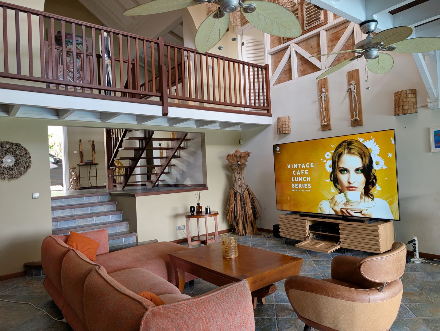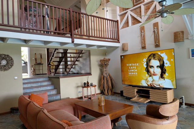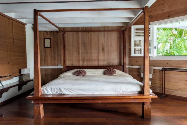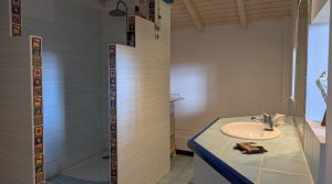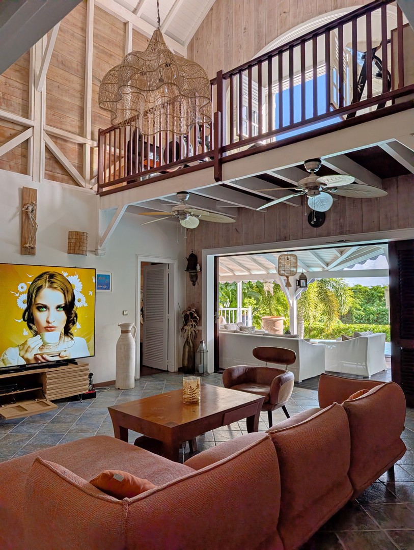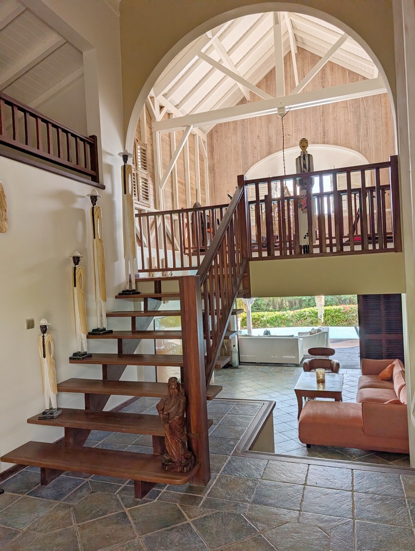 À l’étage, une mezzanine ouverte profite d’une vue mer dégagée et accueille actuellement un espace sport. Deux chambres supplémentaires, chacune avec salle d’eau ou salle de bain privative et WC, complètent ce niveau. Les parquets en IP rouge renforcent l’harmonie et l’esprit chaleureux de la maison.