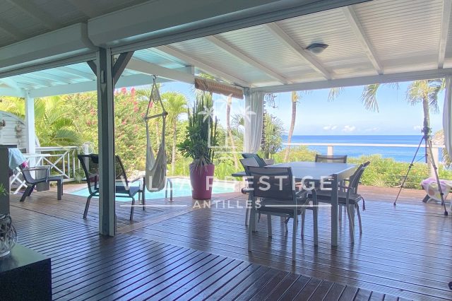 La terrasse ouverte sur la mer et la piscine privative créent un espace de vie extérieur privilégié, où l’on profite pleinement du paysage, de la brise et du charme incomparable de Deshaies.
