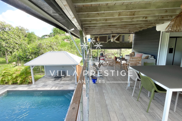 La piscine, de dimensions 6,8 x 4,1, au sel, est chauffée par panneau solaire et est entourée d’une plage carrelée et en deck avec un carbet de 15 m² et une terrasse couverte de 34,6 m².