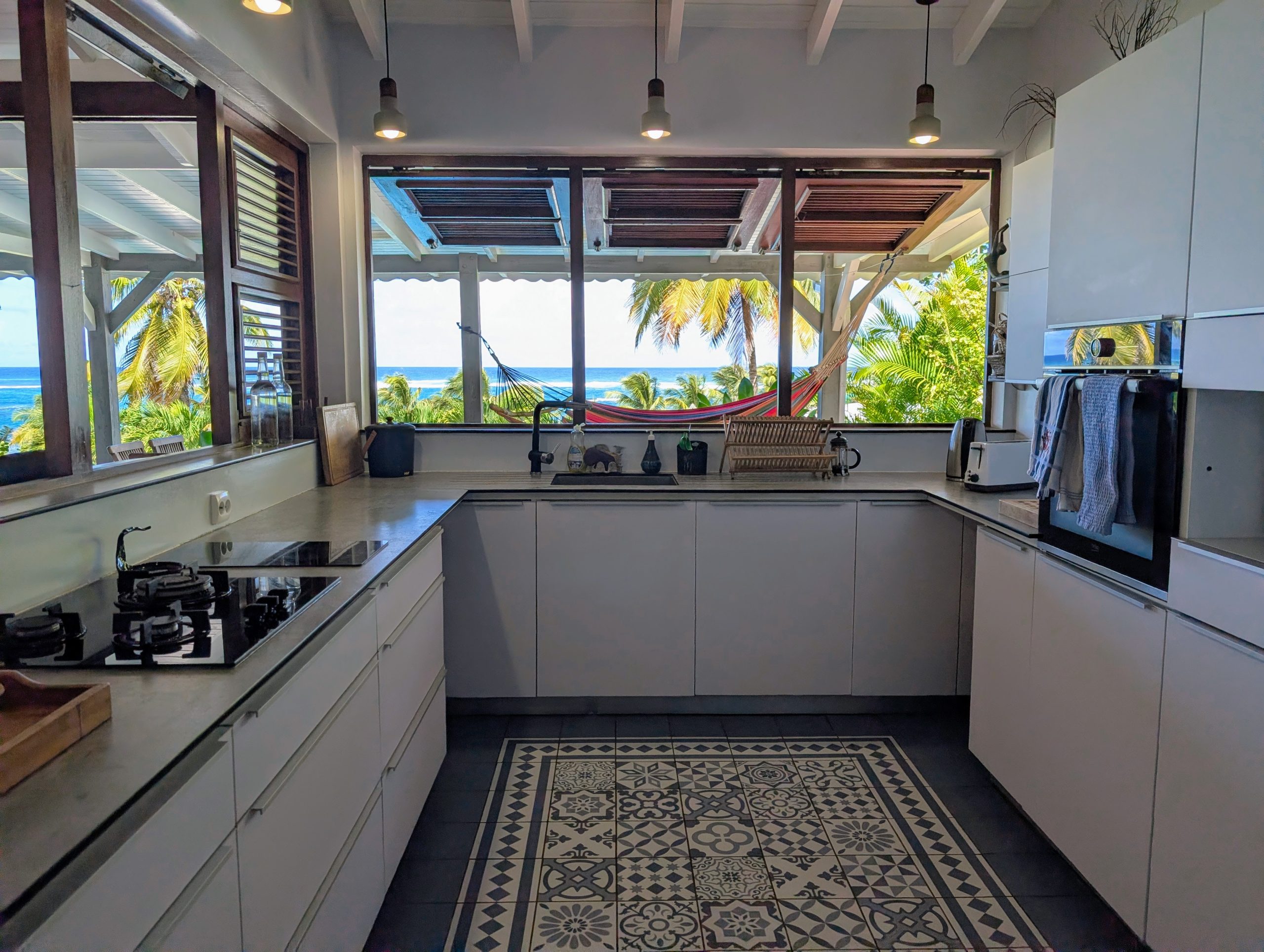 Véritable perle en première ligne mer, cette villa atypique située dans le très recherché quartier des Alizés au Moule offre un cadre de vie rare et privilégié. En bout d’impasse, elle garantit calme, intimité et accès direct au littoral, avec une vue mer dégagée et permanente.